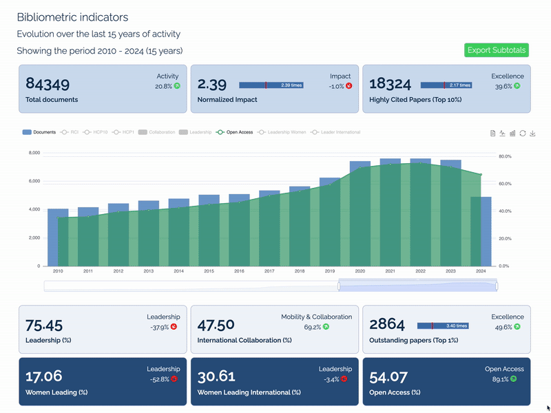 Gain insights into research performance and human resources with detailed bibliometric indicators like publication counts, normalized impact, excellence, or leadership. Human resource indicators classify researchers by career stage and productivity, emphasizing gender diversity and output efficiency. This integrated approach supports informed decisions for institutional growth and global impact.