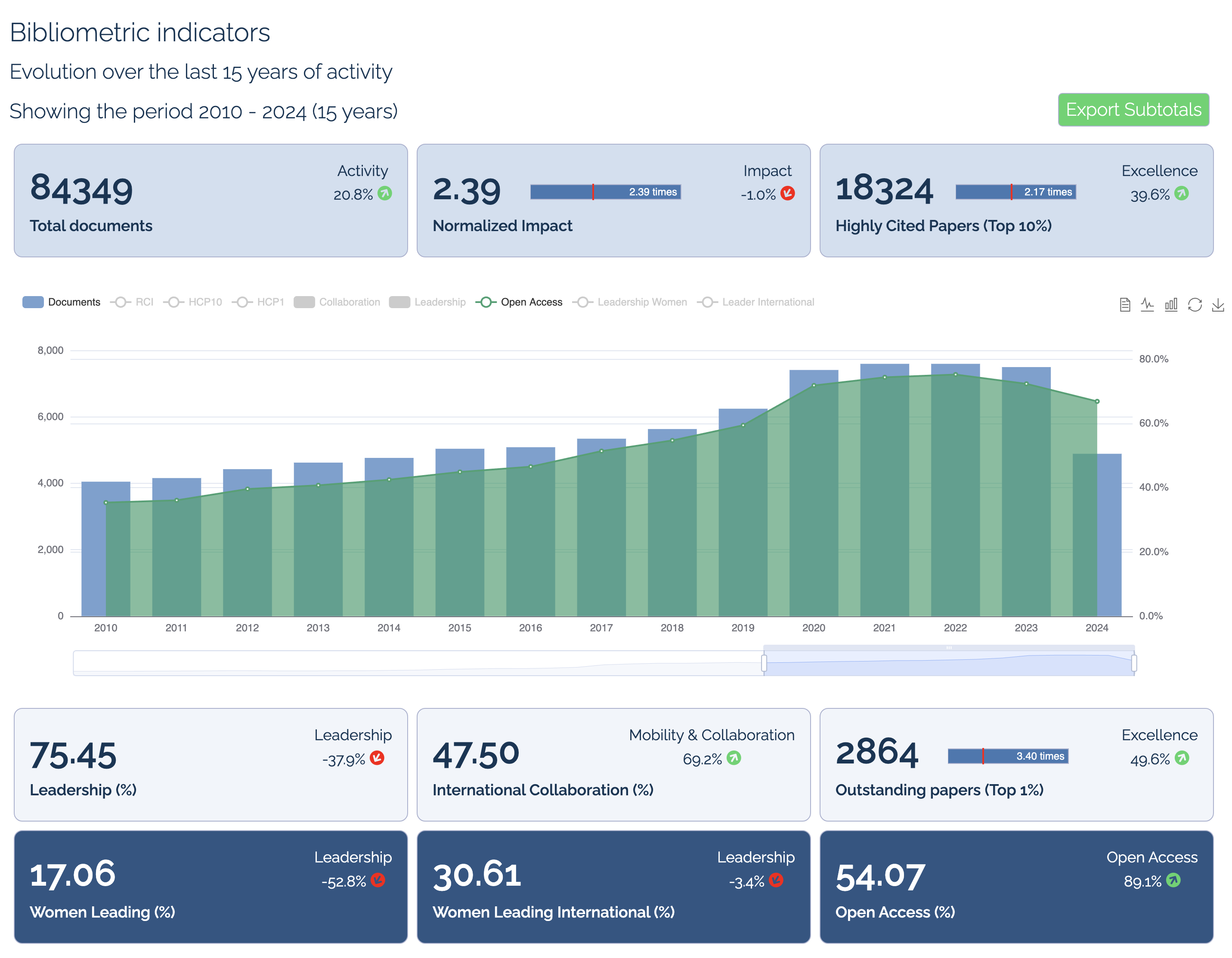 - Excellence & Collaboration metrics: highly cited papers, international collaboration and leadership in co-authored works.